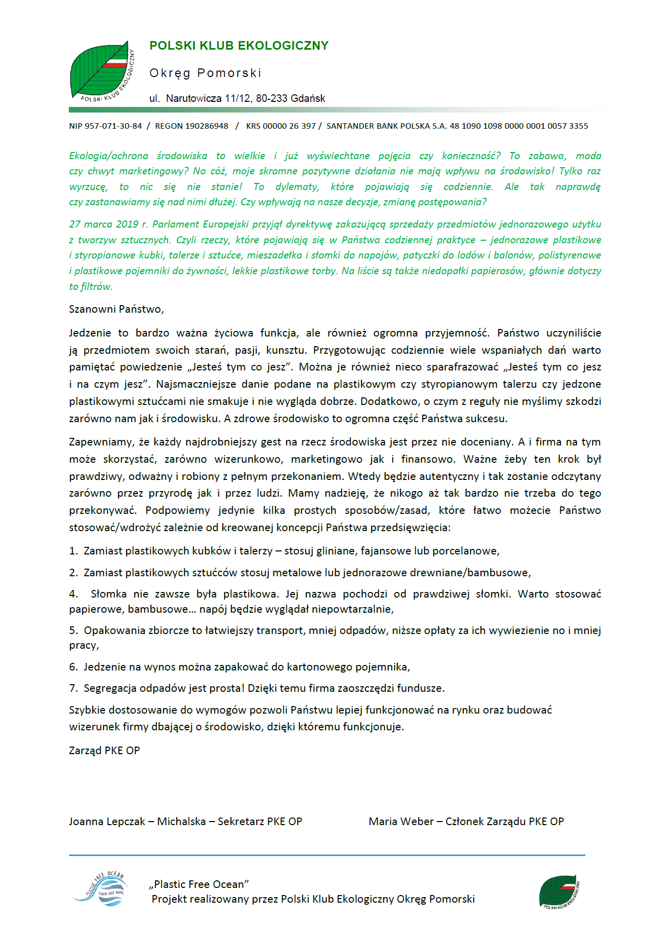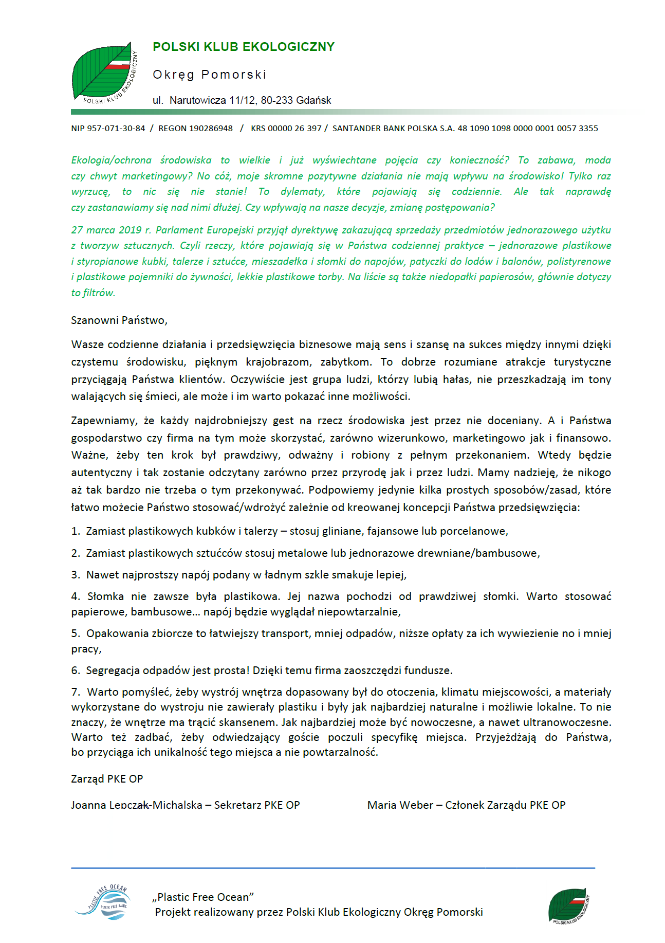 Międzynarodowy projekt pt. Plastic Free Ocean realizowany przez Polski Klub Ekologiczny Okręg Pomorski we współpracy z Litwą, Łotwą, Estonią, Ukrainą, Rosją i Białorusią wspierany przez Koalicję Czystego Bałtyku w Uppsali. W ramach projektu był prowadzony monitoring mikro- i makroplastiku w rzekach na Pomorzu. Odbył się również warsztat metodą burzy mózgów pt. Plastic Free Ocean w celu sformułowania propozycji i wspierania zmian polityki w Regionie Morza Bałtyckiego jako regionu wolnego od tworzyw sztucznych jednorazowego użytku (ang. Single use plastic – SUP). Ponadto przygotowane zostały tablice edukacyjne.